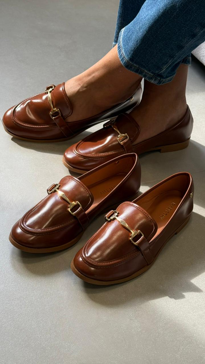 O mocassim Rafitthy caramelo em courino combina elegância e conforto para o dia a dia. Com detalhe dourado no cabedal, o modelo traz um toque sofisticado e moderno, perfeito para compor looks práticos e estilosos.