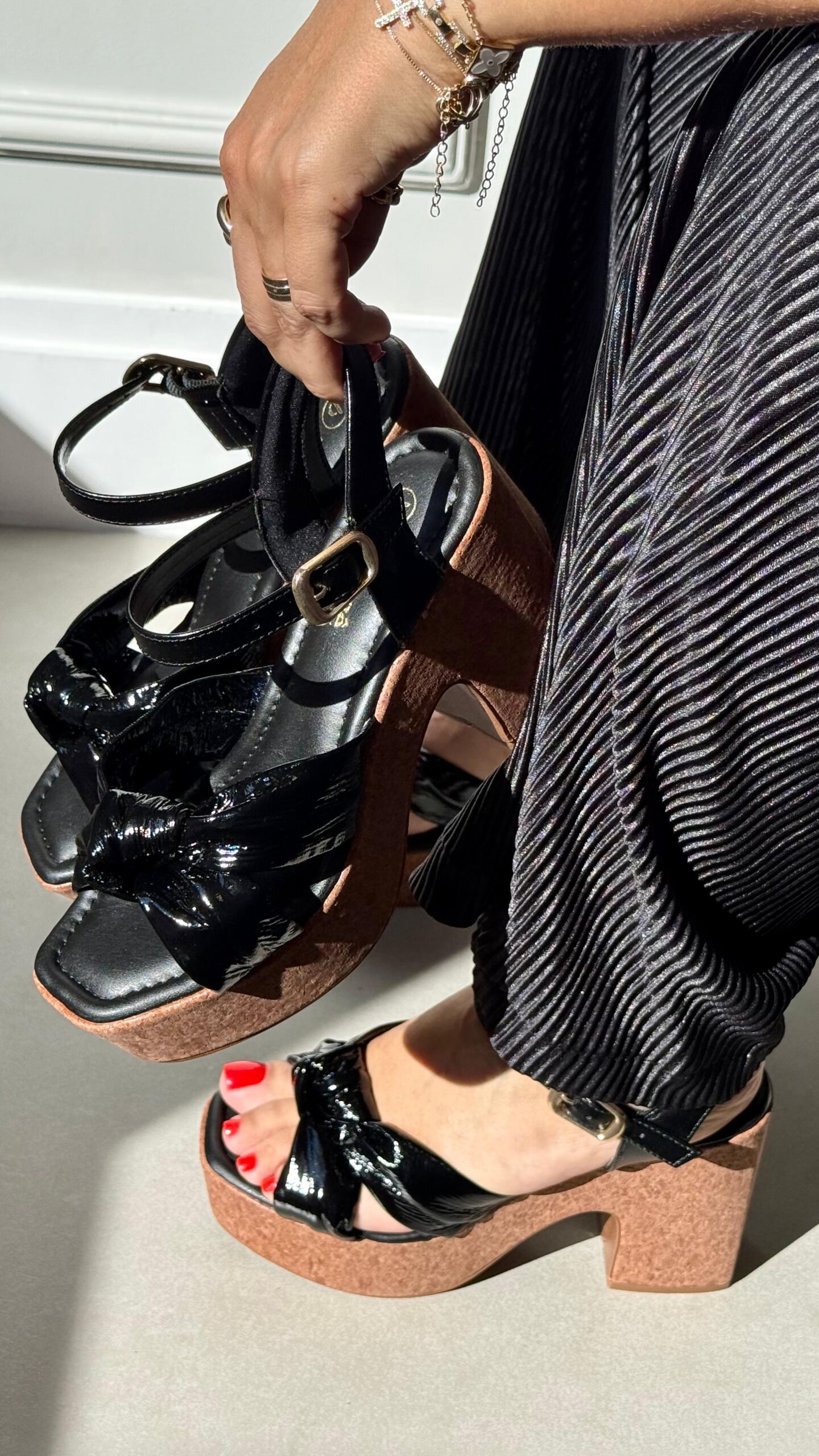 Sandália anabela preta com salto de 10 cm e meia pata de 4 cm, garantindo altura com muito conforto. Modelo versátil e elegante, ideal para compor looks modernos e cheios de estilo em qualquer ocasião.