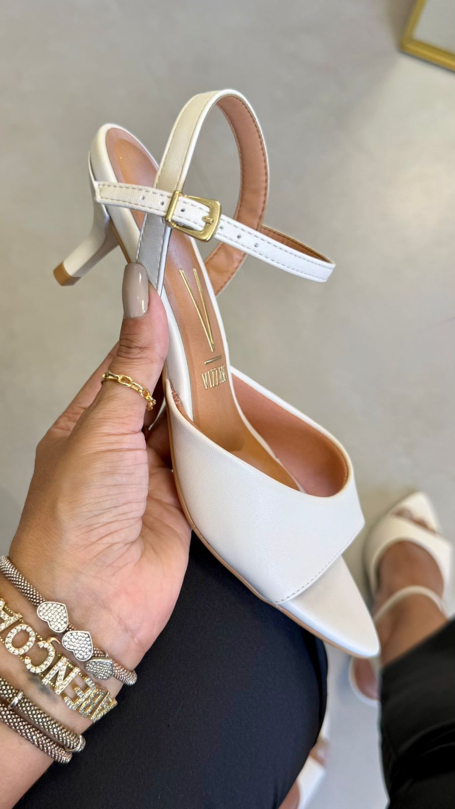Sandália salto 5 cm em napa brilhante off white, com design elegante e atemporal. O acabamento luminoso valoriza o visual, enquanto o salto médio de 5 cm oferece conforto e estabilidade para o uso diário. Perfeita para compor looks sofisticados, do casual ao mais arrumado, com leveza e versatilidade.
