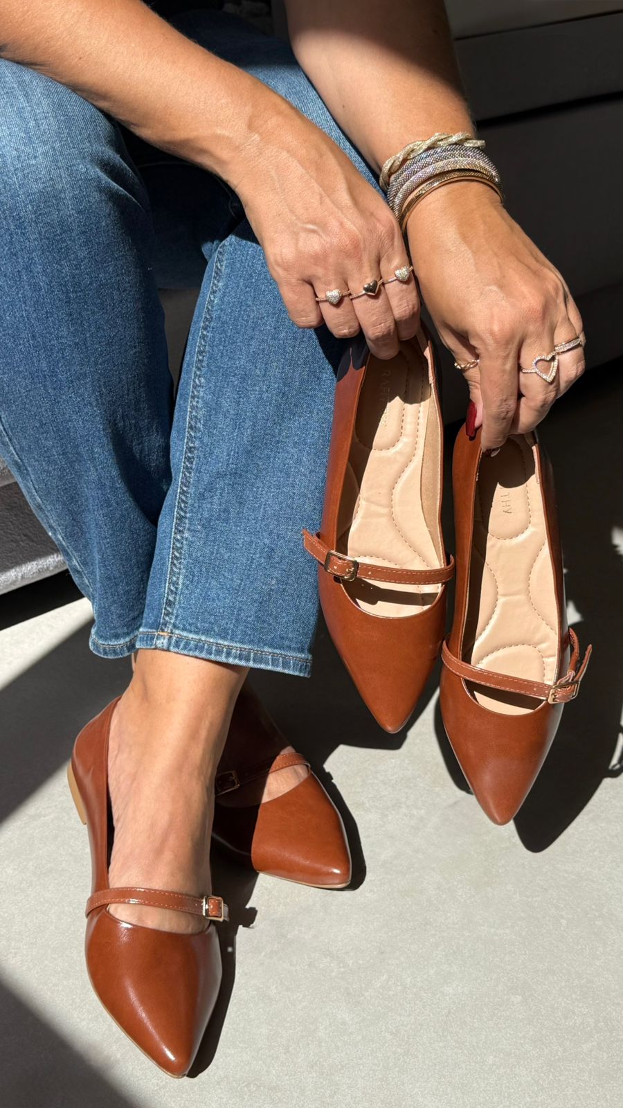 A sapatilha Rafitthy caramelo de bico fino com tira combina elegância e modernidade. Confortável e cheia de estilo, é perfeita para dar um toque sofisticado aos looks do dia a dia.