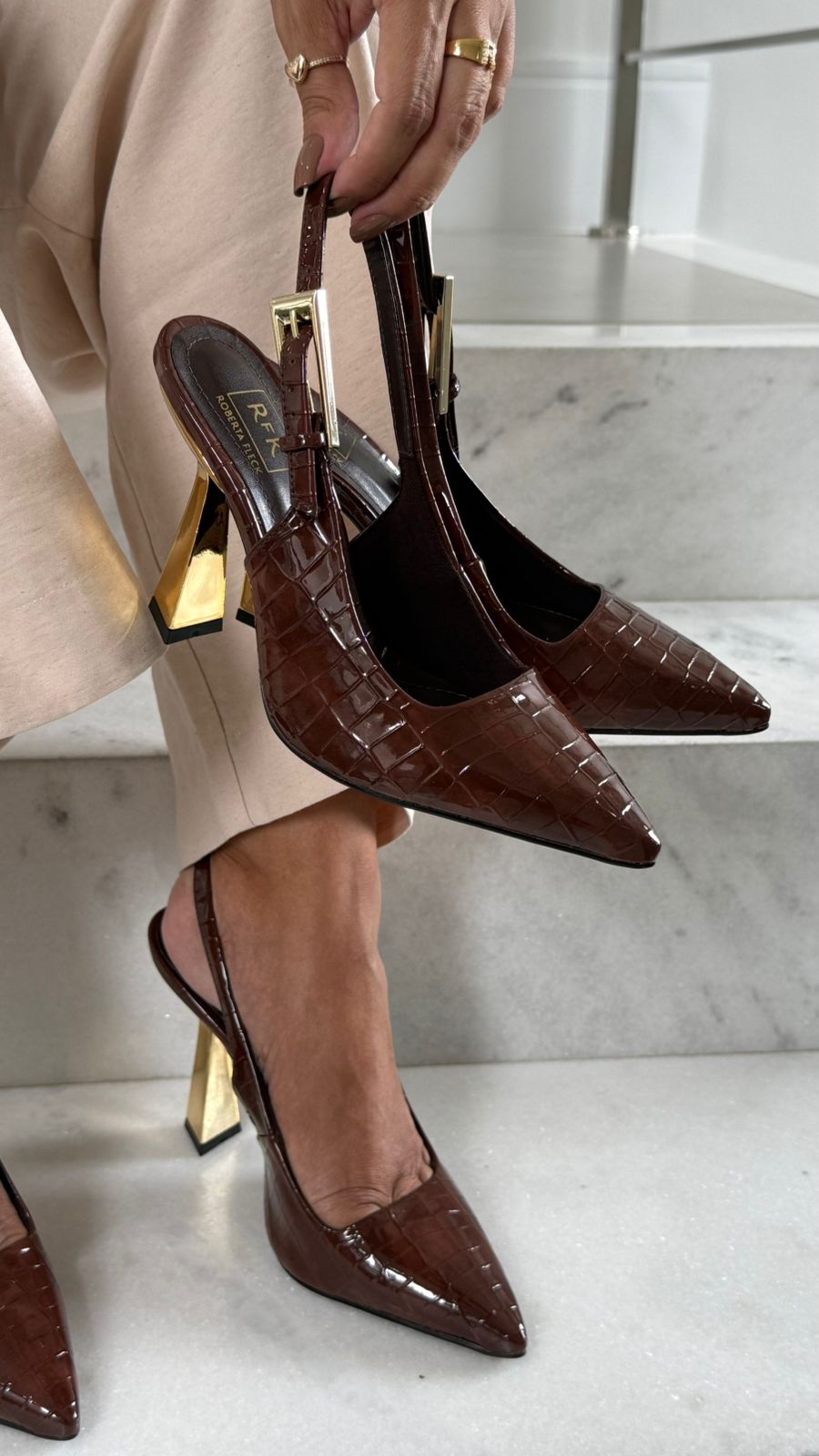 Elegante e sofisticado, o sapato slingback RFK na cor chocolate possui um lindo salto dourado de 10cm, que valoriza a silhueta e traz um toque de luxo ao visual. Com design moderno, tira traseira ajustável e palmilha macia, garante conforto e estilo para ocasiões especiais ou produções mais refinadas.