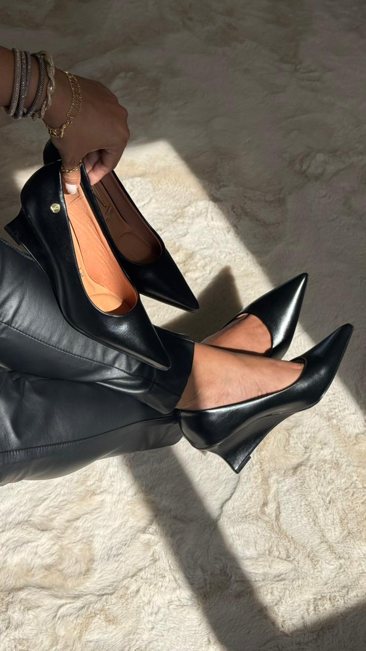 O scarpin Vizzano com salto anabela de 7cm na cor preta combina elegância e conforto em um design moderno. Estável e versátil, é perfeito para o dia a dia, garantindo estilo com praticidade.