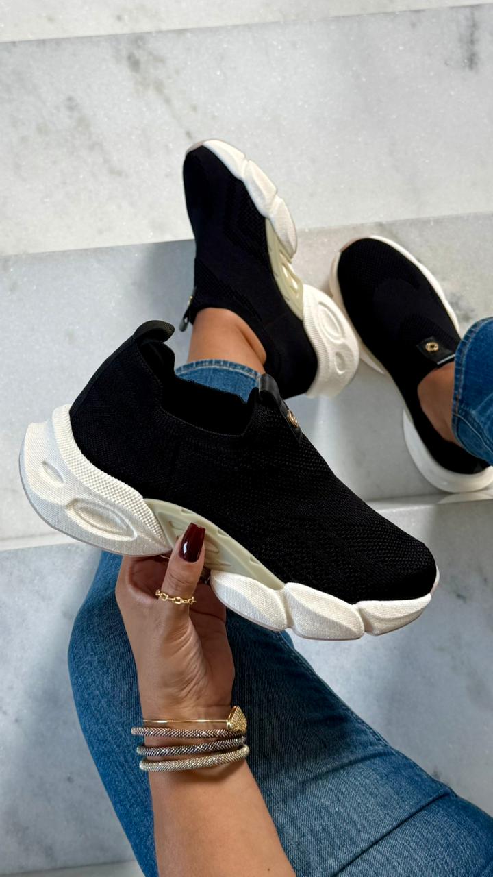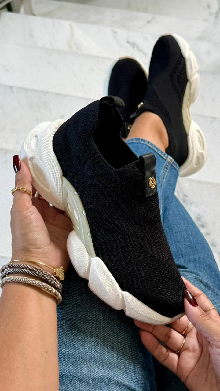 O tênis Bebecê em knit preto com solado Mega Bounce oferece máximo conforto e leveza para o dia a dia. Com malha flexível que se ajusta aos pés e amortecimento macio no solado, garante bem-estar e estilo em cada passo.