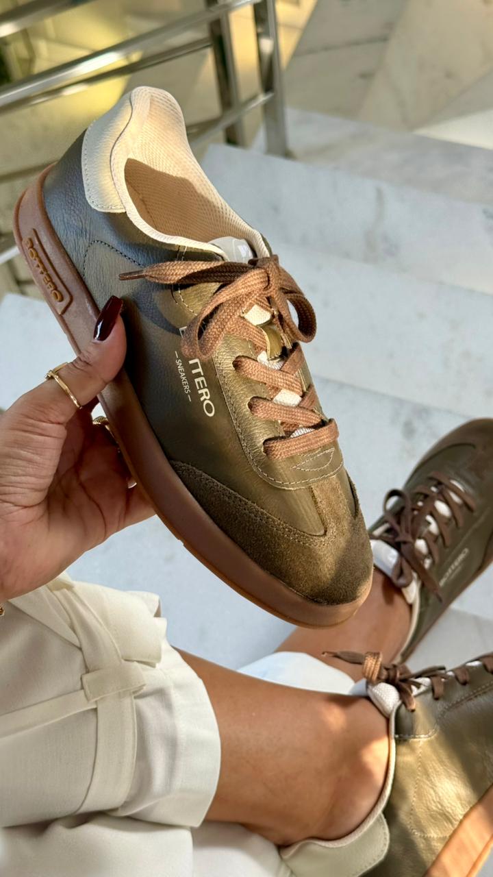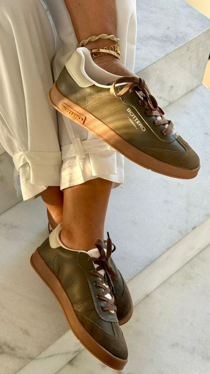 O tênis Bottero em couro na cor verde musgo combina conforto e estilo em um design moderno e versátil. Ideal para o dia a dia, ele adiciona um toque sofisticado aos looks casuais. ?✨