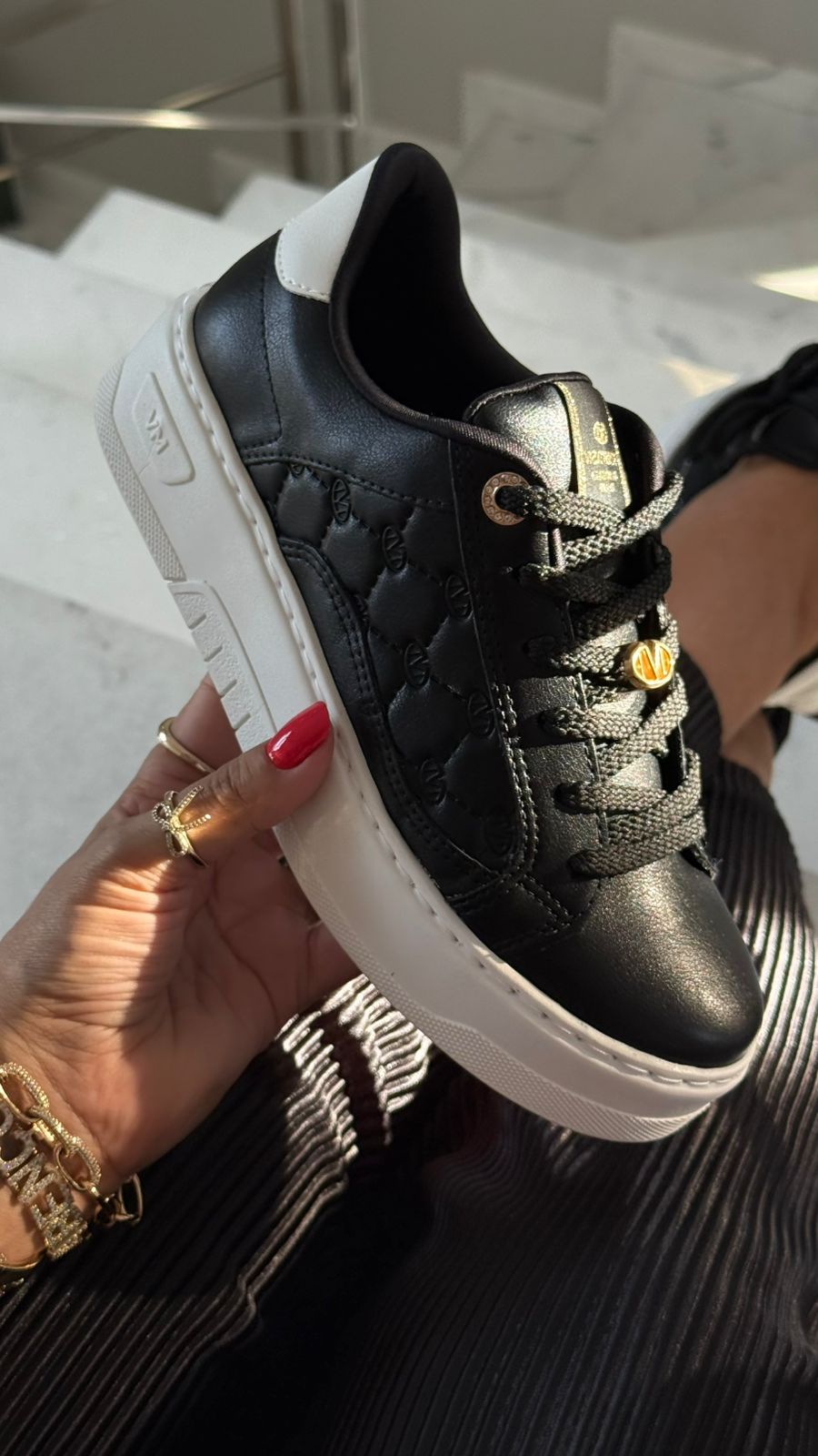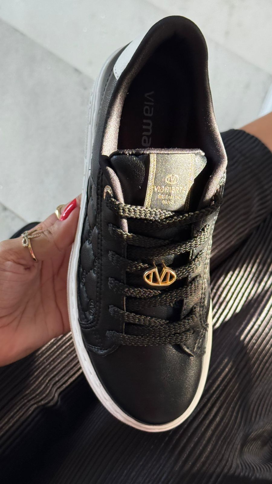 Tênis Via Marte preto, casual e confortável, com detalhe lateral em textura que lembra o matelassê, acrescentando um toque de elegância ao visual.